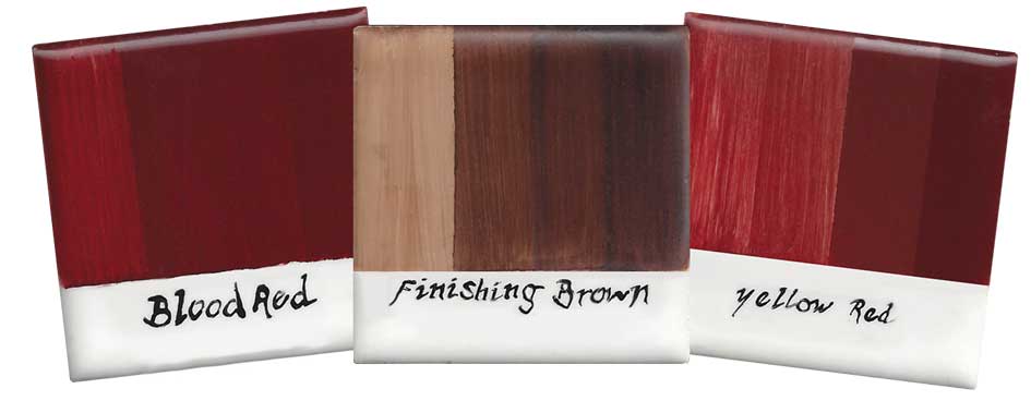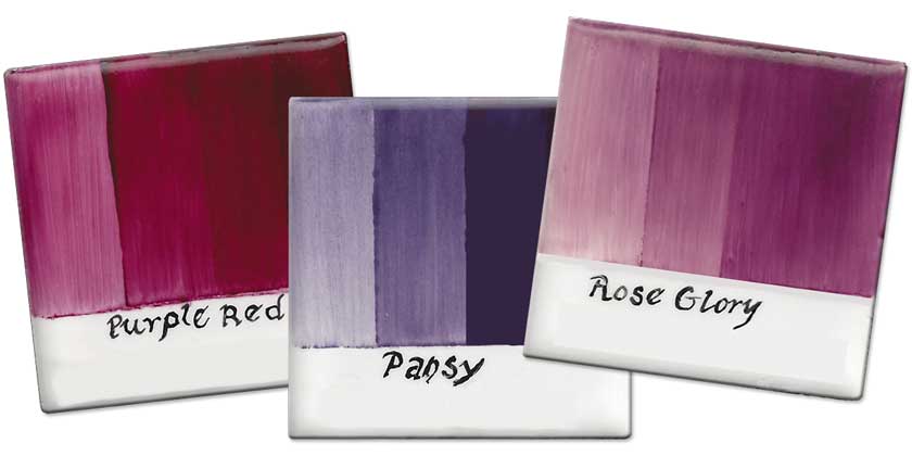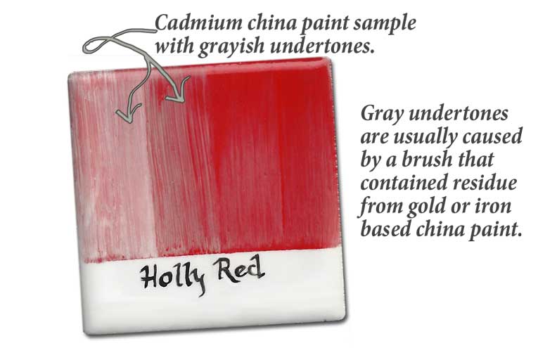 Generally speaking, the gold colors are, pinks, rubies and purples. They can be fired in an electric kiln at higher temperatures and generally do not burn out when fired and can be fired at a higher temperature than iron and cadmium china paint. Gold based colors contain gold and tend to cost a little more than iron and cadmium based colors. Iron colors are yellows, blues, greens, browns, grays and black. An exception to the rule is Violet of Iron. Generally, the iron reds are the yellow reds, blood red and dark red. These reds do not fire looking like the brilliant reds that we associate with the winter holidays. The iron reds are less intense and look almost brown after firing because they contain iron. I have fired these reds too hot and learned that they turn varying shades of brown red or brown which might not be appealing when painting subjects like apples and cherries. It is possible to achieve a holiday red by painting two coats of yellow red and a coat of blood red and firing in between each coat of paint. Another beautiful red can be achieved by mixing one half American Beauty with one half Pompadour Red or one half American Beauty and one half Blood Red. This mixture is wonderful for painting holiday and victorian themes and works great with other paintings that require a deep rich red. The American Beauty/Blood Red is one of my favorite china paint mixtures. This category is comprised of colors that might contain some iron and many that do not contain iron. Also this category includes paint that might be contain of an assortment of colorants and varying ratios of flux. Some of the iron colors in this category are modified with colorants such as manganese or zinc chromate that make up varying shades of red and brown china paint. There are iron colors that originate from iron bearing clay soil. Examples of paint from iron bearing clays would be umber or sienna. Some of the colors in this category are less problematic when they are mixed together with other china paint than mixing china paints with colors that contain pure red iron oxide. Some black china paint may contain black iron oxide, yellow china paint may contain ochre or yellow iron oxide. Many greens, blues, yellows, greys and browns do not contain iron. Yellow can be the wild card or exception to the rule. As a general rule I tend to paint with Mixing Yellow as it has been the most reliable yellow on my pallet when mixing with other colors. If using yellow, test fire alone and as a mixture with other colors. In summary, iron colors mix well with iron colors, gold colors mix well with gold colors. There are exceptions. For instance, some gold colors and iron colors will mix and get along throughout the firing process. I continue to be surprised by color combinations and like to test fire experimental color combinations before applying china paint to artwork. This is a category of colors that should be stored on a separate pallet. It is best to isolate cadmium based paints from the iron based, gold based and everything else colors. If you decide to keep all of your china paints on one pallet, cadmium colors can reside with your iron and gold based colors, however, be mindful of the possibility of mixing a cadmium color with a gold or iron based color during your painting sessions. I learned about cadmium based china paint the hard way. It is easy to be lured by colors labeled as Holiday Red, Fire Engine Red, Deep Coral, Tangerine and Bright Orange. They are beautiful and brilliant when applied to porcelain by themselves or when mixed with each other. However, they do not mix well with iron and gold based and some of the everything else colors and might cause a symptom called firing out. This means disappearing colors on a painting after firing because cadmium and a gold based or iron based color was combined or overlapped by a cadmium based color. Sometimes the combination will test fire well and even fire perfect, but why take the chance? As a general rule, keep the cadmium colors on a separate pallet and in separate areas on your painting. They can be painted next to iron, gold and miscellaneous china paint, just avoid overlapping. Some painters go as far as to use a set of separate brushes and brush cleaner for cadmium based colors. Above is an example of a cadmium color painted with a brush that contained gold or iron residue on the bristles. Notice the grey cast in the paint. Although the brush was thoroughly cleaned and showed no signs of lingering paint, the gray undertones appeared after firing in the kiln. Now when using Cadmium based colors I use a brush cleaner that is dedicated to the Cadmium based color pallet and also use a separate set of brushes and plan the use of a cadmium color before adding it to a painting. A good practice exercise is to use cadmium colors by themselves. Santa Claus, berries and candy canes are a good subjects to practice while getting acquainted with cadmium based china paints. Also, I have experienced good results with Mixing Yellow and Cadmium colors but not always. Dallas China Company and Maryland China Company stock Mixing Yellow. Often, you will find china paint featured exclusively by an artist with a catchy name. Keep in mind that there are very few producers of china paint throughout the world. Most of the china paint offered by artists are also offered by the larger suppliers. By test firing your colors, it is possible to find identical paint colors with different names. This is not an unethical practice, however, it is is a marketing technique. For instance, in the printing industry, Pantone produces ink colors and may offer the color Merlot and another ink supplier might offer the similar or same color as Deep Dark Wine. For this reason, I like to test fire colors on a chard of porcelain and label with the color name and the supplier. Sometimes, after test firing, I find paint vials that are identical in color but differ in name. Another scenario is some china paints mi