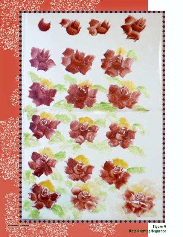 Apply paint in the rose areas using the step by step guide on figure 4 above. Using a wipe out tool, also known as a clay shaper or the corner of a clean stiff brush, follow the steps in the diagram and wipe out the shape of the rose.