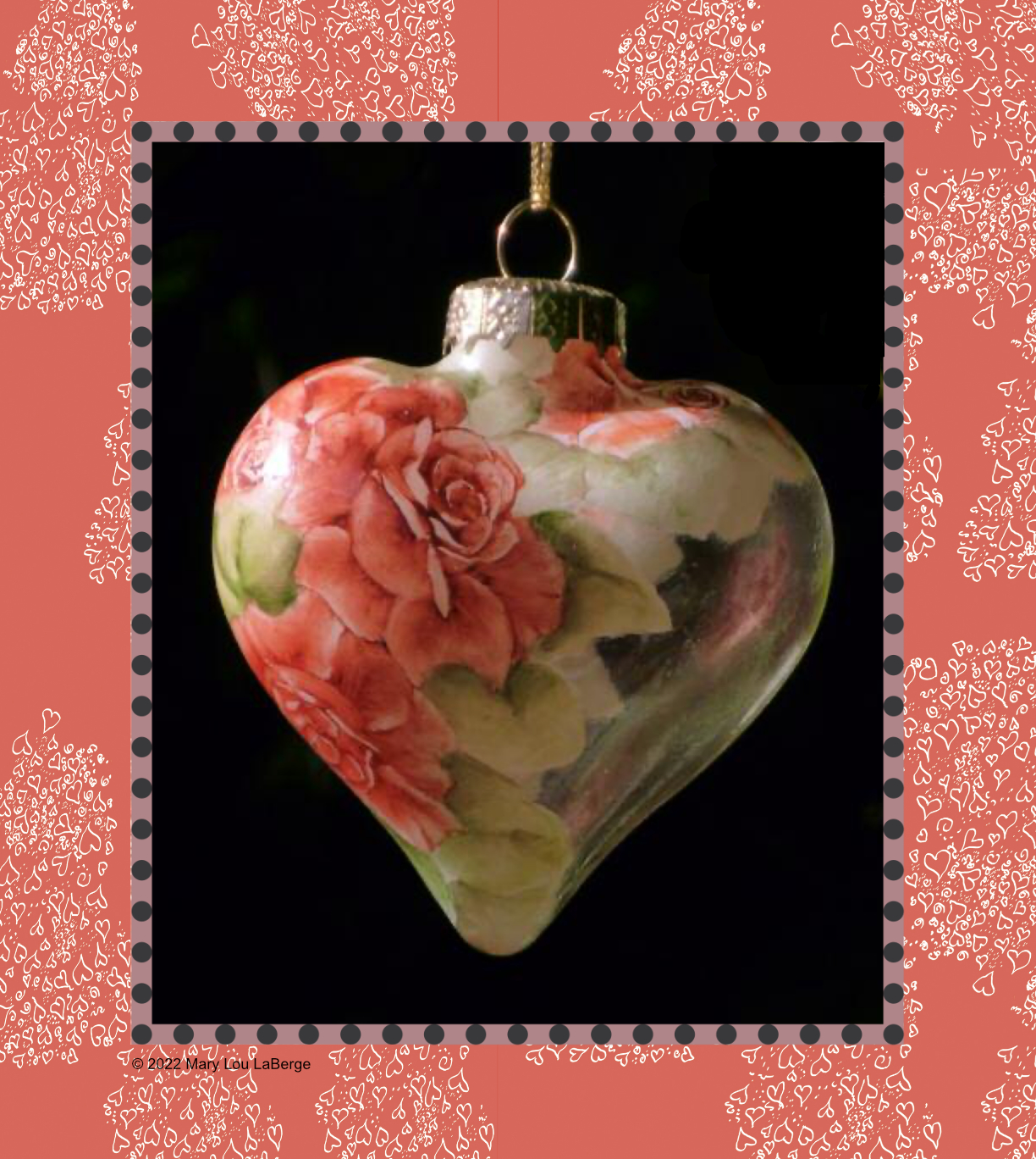 There isn't a pattern for this design. However, you can develop a design by using a china marker and draw a basic outline of roses and leaves onto the glass ornament. Paint white over the china marker. The white paint will look grayish as it mixes with the china marker, however, the china marker will fire out in the kiln leaving a bright white painting surface like the example on Figure 1 above.