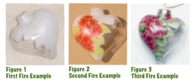 Figure 1 above is an example for the base coat. Paint the white glass paint or white glass enamel onto your ornament. Remove the metal hanger before firing. Lay the ornament on the kiln shelf to fire. Do not use kiln furniture to prop up the ornament. Fire at Cone 022 which is about 1087 degrees Fahrenheit.